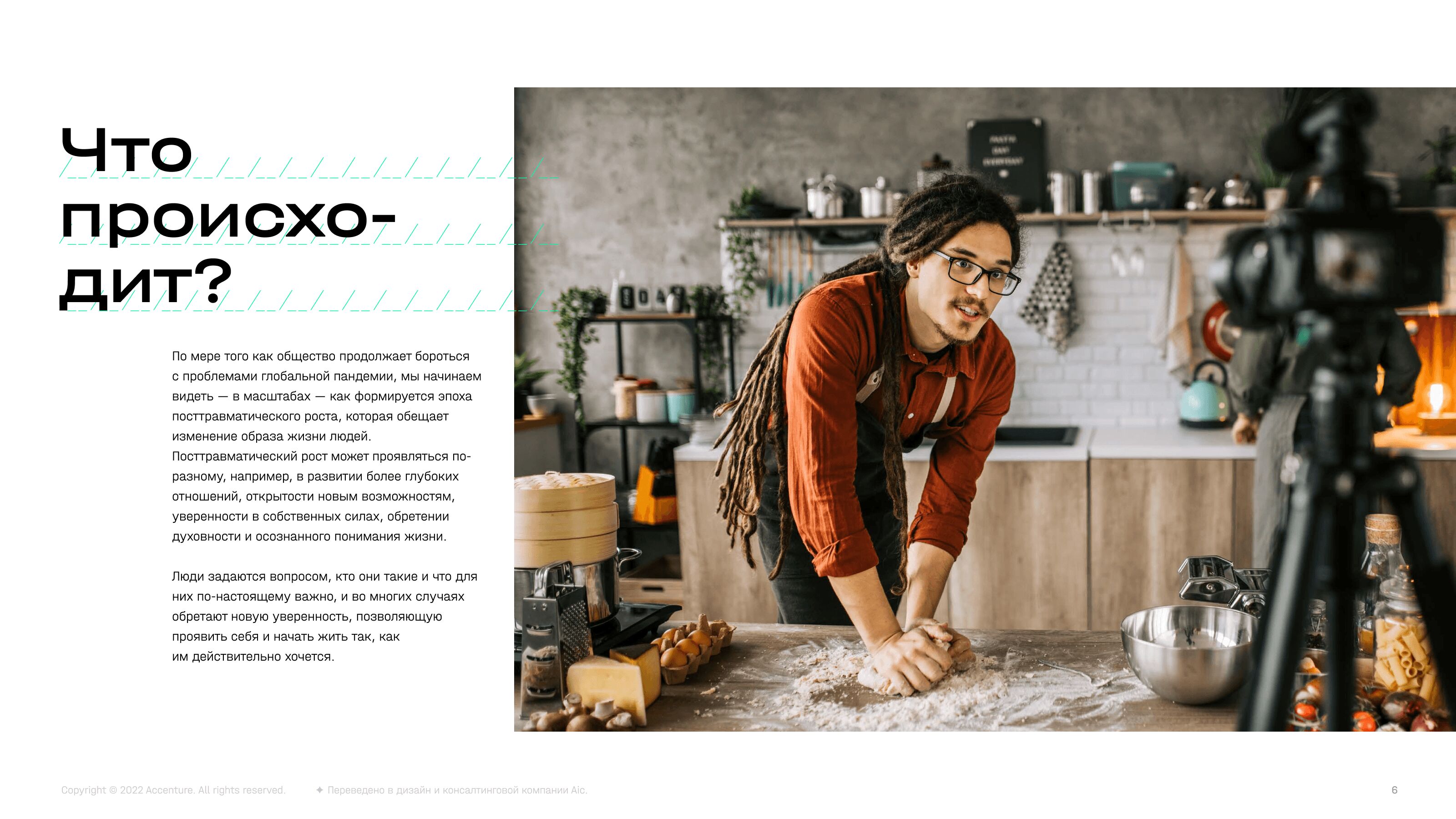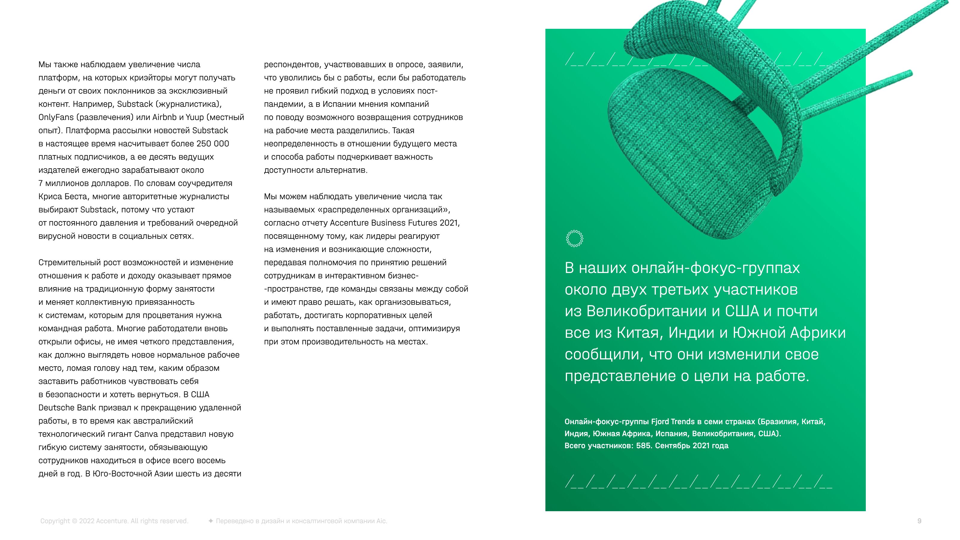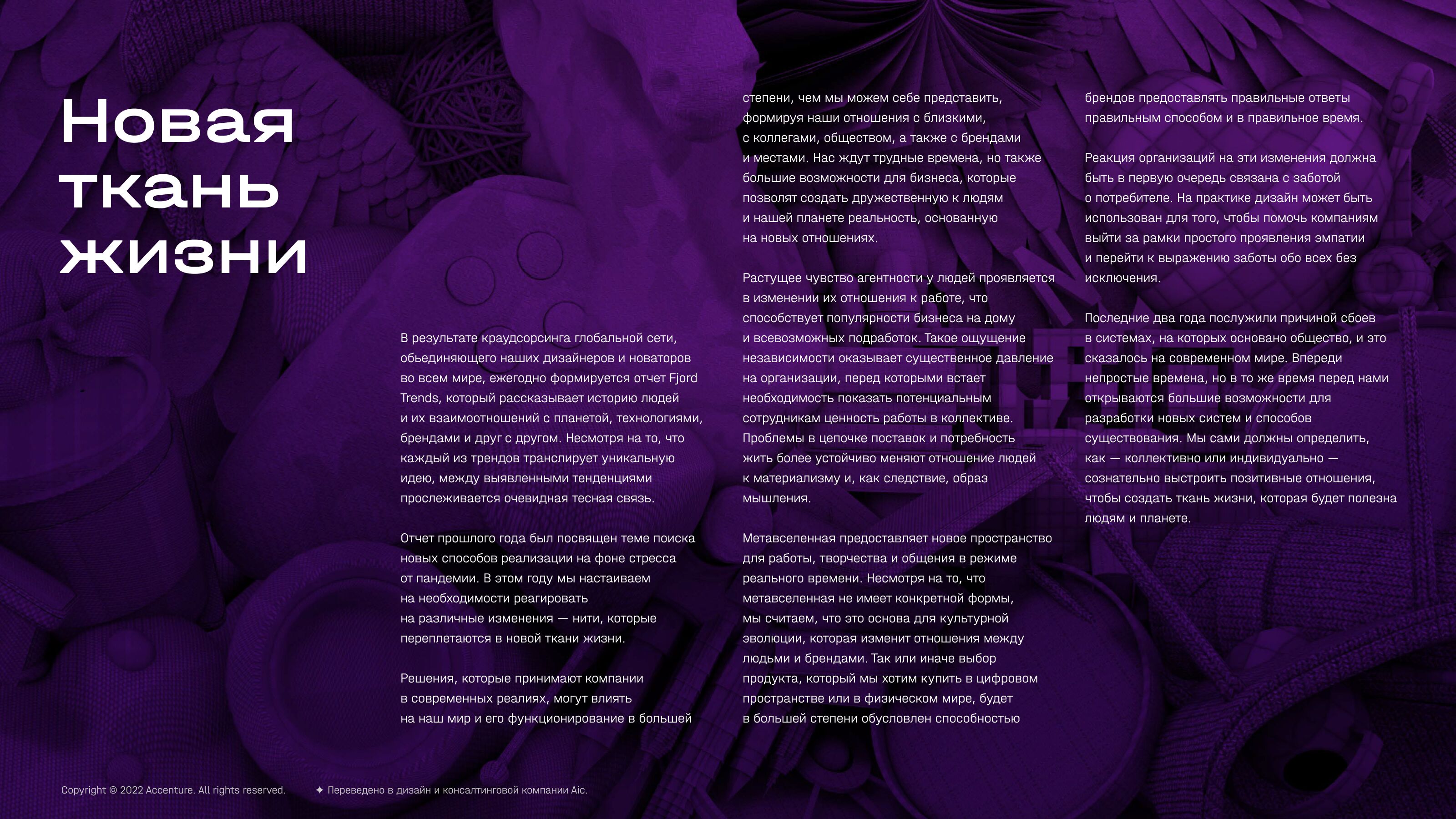 каждый год Accenture пристально отслеживает потенциально важные тенденции и сигналы по всему миру в попытке вовремя уловить изменения в обществе, бизнесе и технологиях. спустя несколько месяцев анализа, появляется очередной отчет Fjord Trends. он отличается от аналогичных в первую очередь фокусом, так как включает не более 5–7 глобальных трендов, во вторую — глубиной анализа.