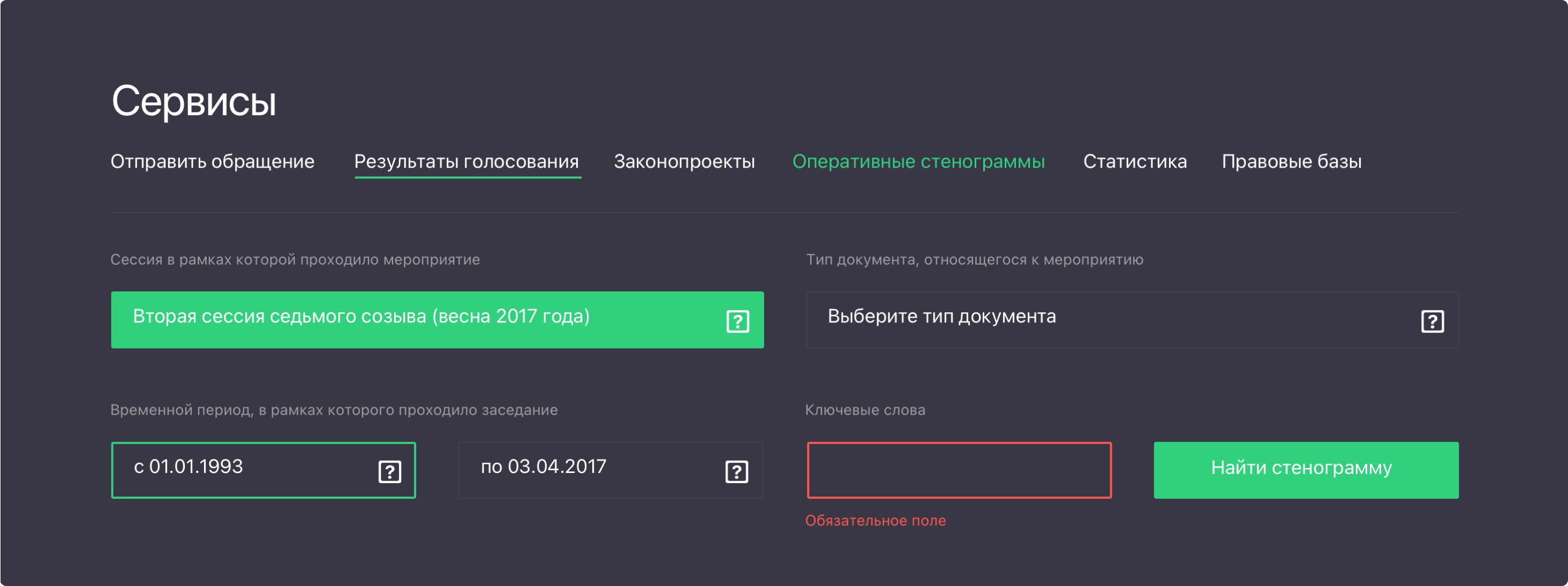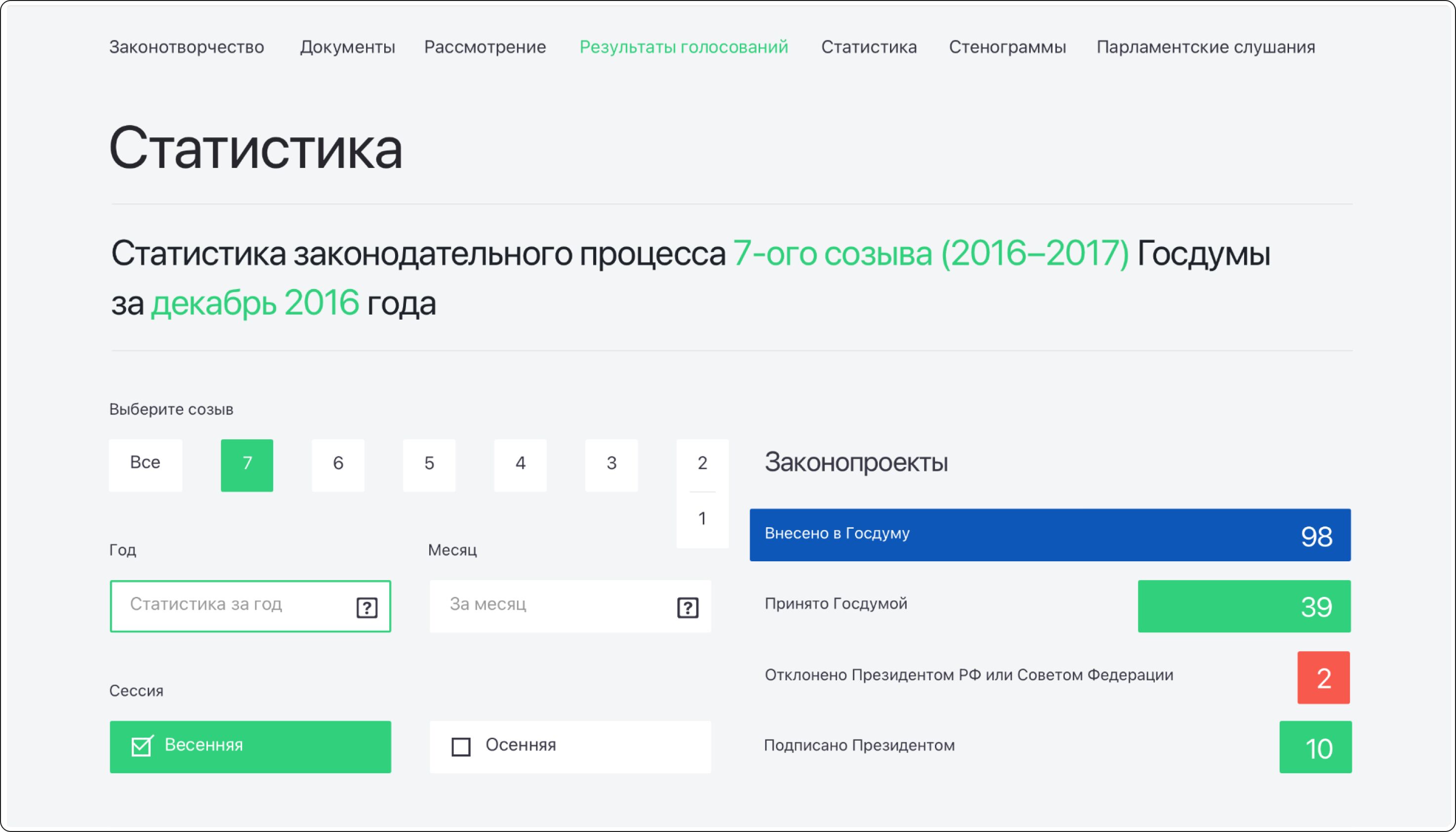 важным дополнением на новом сайте стало появление раздела «сервисы», благодаря которому пользователи в один клик могут найти интересующие их законопроекты и ознакомиться со всей документацией на каждом этапе: от внесения до принятия, узнать результаты голосования, отправить обращение, ознакомиться со стенограммами и правовыми базами.